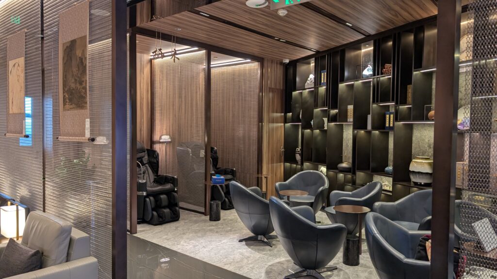 受付を中心に、左右に分かれたラウンジ。空間としてはそう広くはないが、設えは中国らしくも落ち着いた高級感が感じられ、静かな雰囲気である。