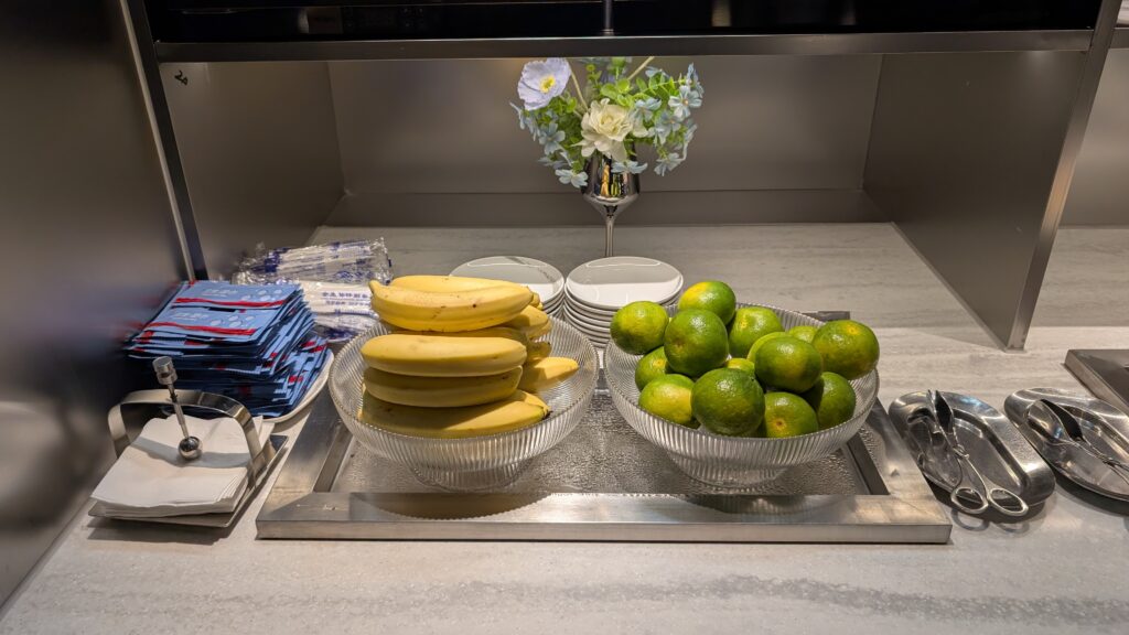 ちなみにビュッフェ台のある部屋とは反対側の方にも、お菓子やフルーツ、お酒などが用意されている。