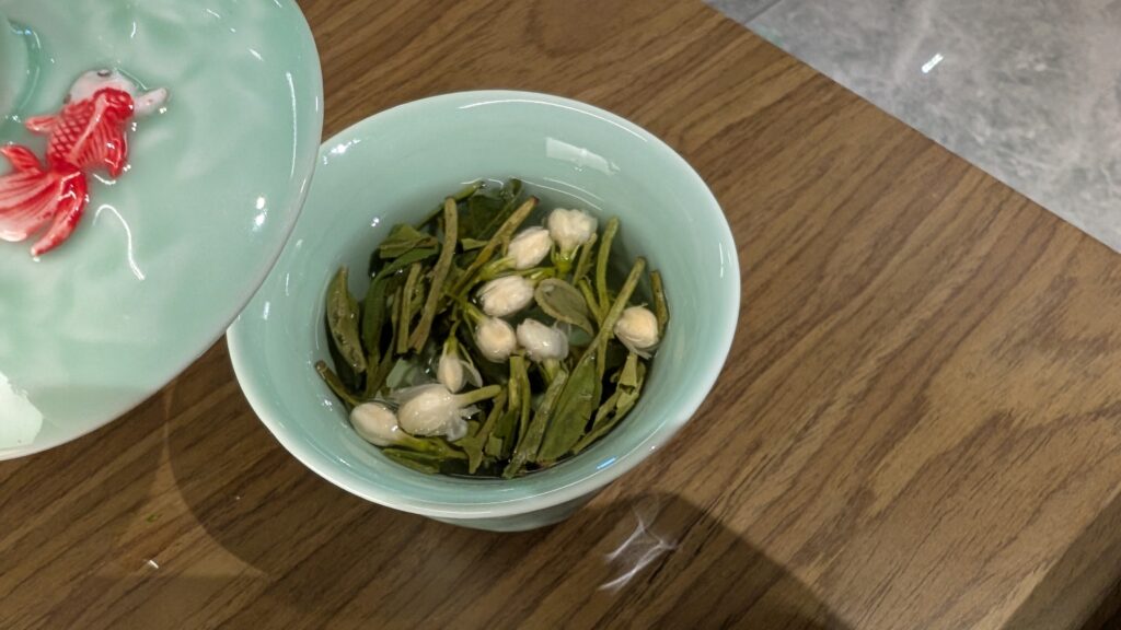 料理を選び席に戻ると、香り高いジャスミンティーが供されていた。素敵な心配り。