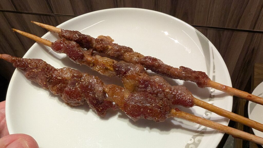 ライブキッチンの鉄板には大好きな羊肉串もあったので迷わず頂いた!どこで食べても羊肉はうまい。
